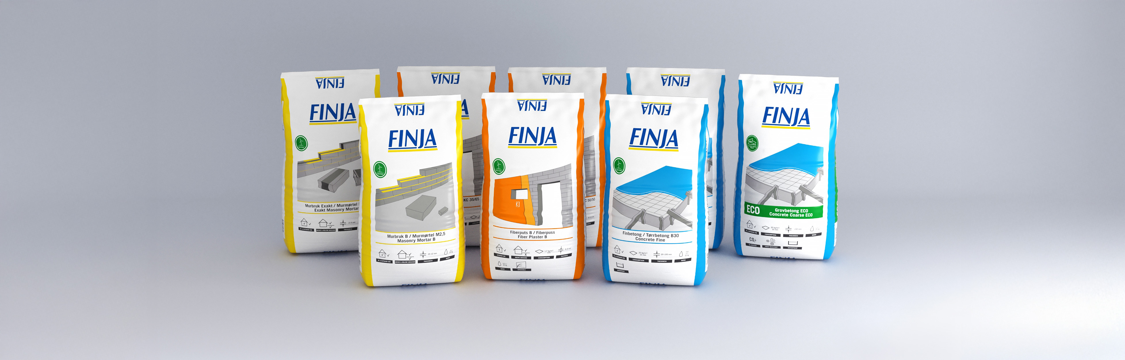 Finja Betong erbjuder ett av marknadens mest kompletta sortiment av torrbruk för murning, putsning, gjutning och lagning. Produkterna är svensktillverkade och enkla att använda – tillsätt bara vatten och blanda.